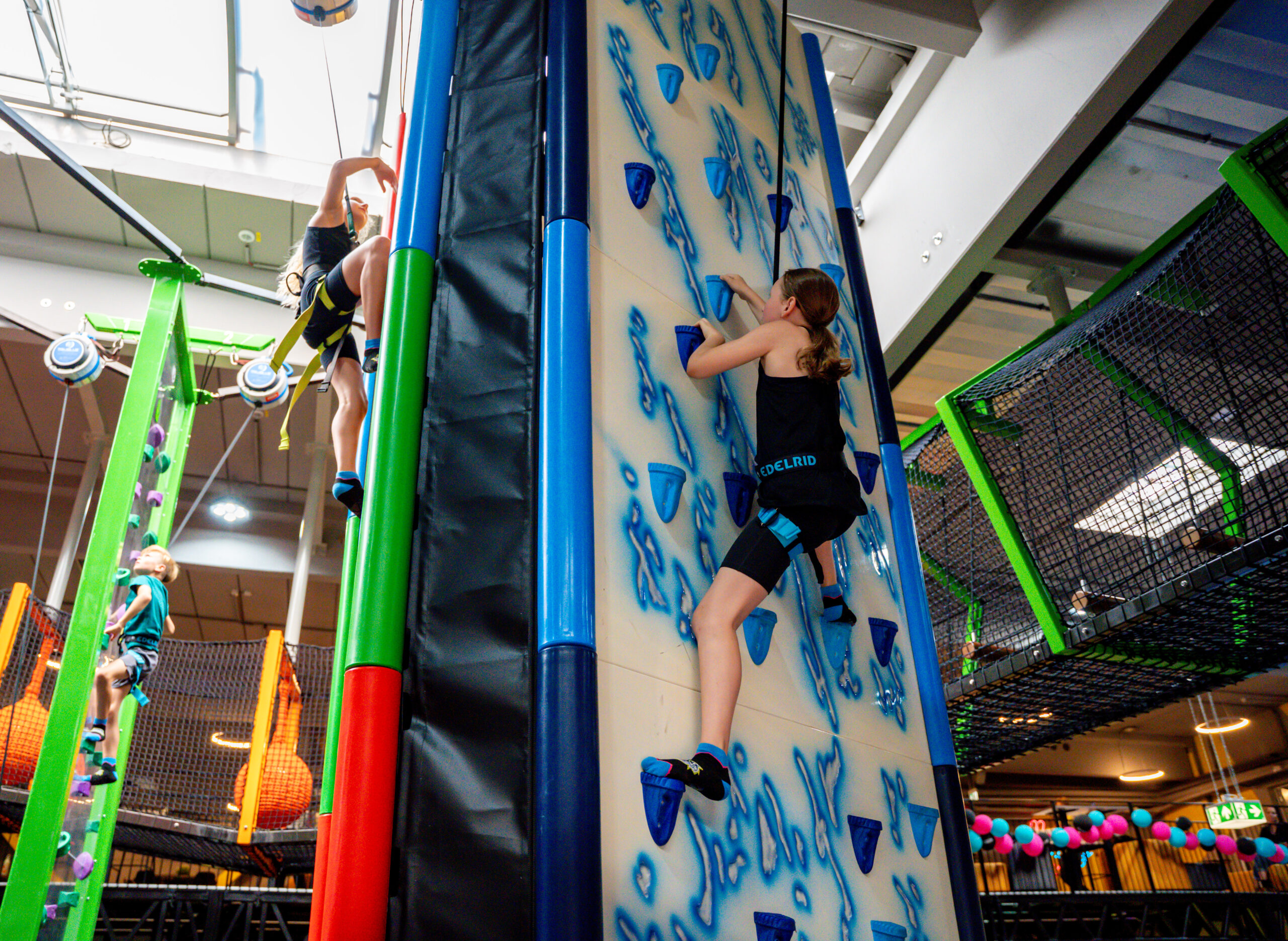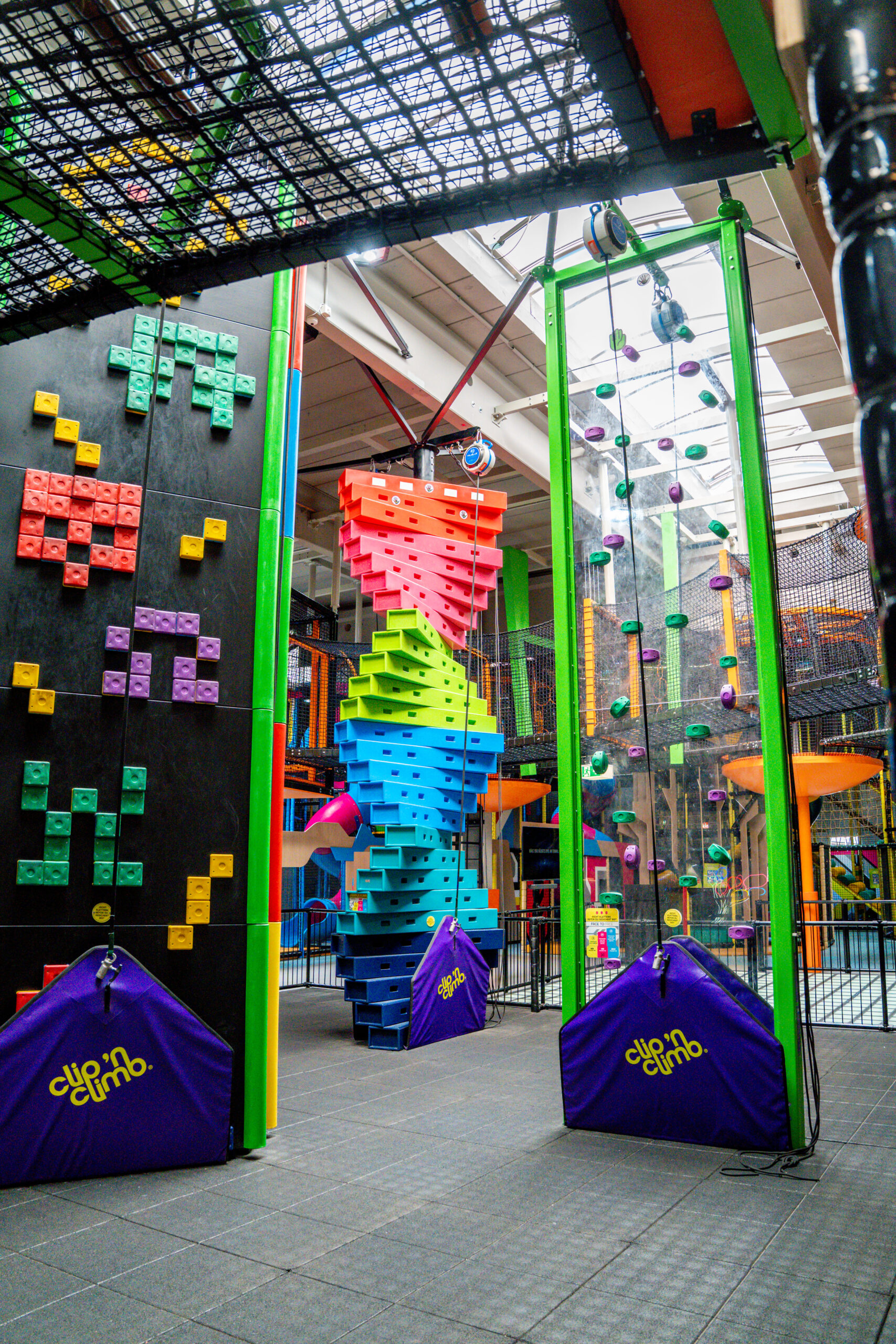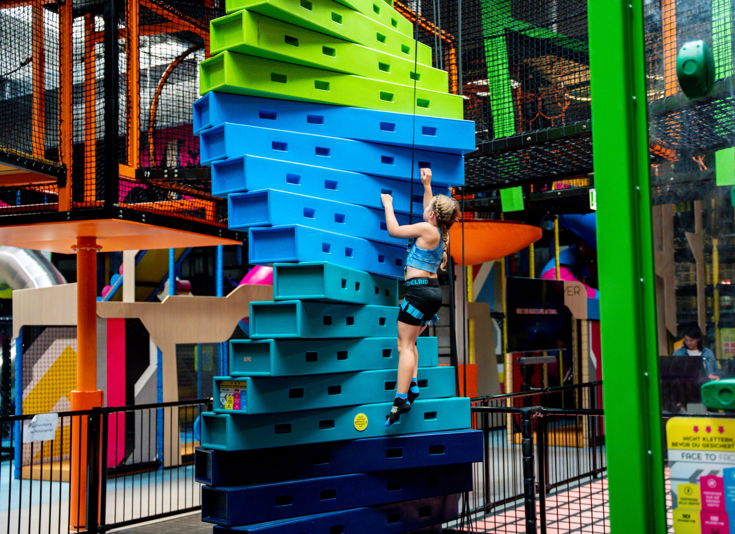 Klettere mutig mit automatischer Sicherung bis unter die Hallendecke. Kletterstationen und Elemente in knalligen Farben und Formen warten auf Dich.
